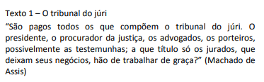 Nessa frase (texto 1), Machado de Assis questiona o fato de os jurados trabalharem de graça no tribunal do júri; como argumento em defesa de sua ideia, Machado só NÃO se utiliza do seguinte: