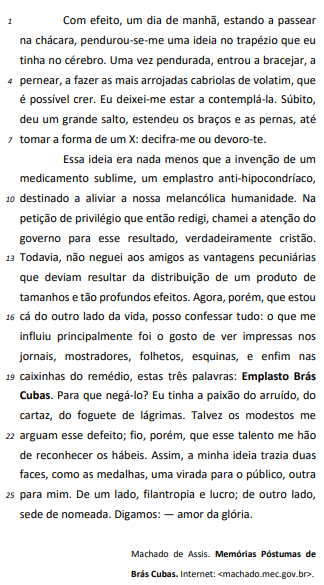 Infere-se do texto que o principal motivo para que o narrador levasse a ideia do emplastro adiante foi o(a)