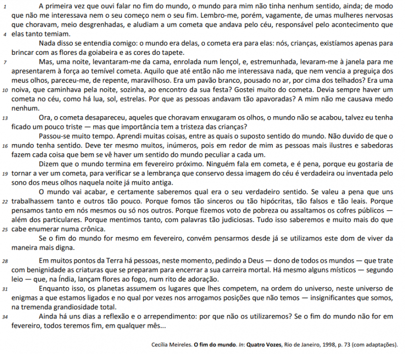 O texto apresenta as ideias da narradora acerca da possibilidade do fim do mundo e as reflexões que, na perspectiva dela, as pessoas deveriam fazer sobre a própria existência.