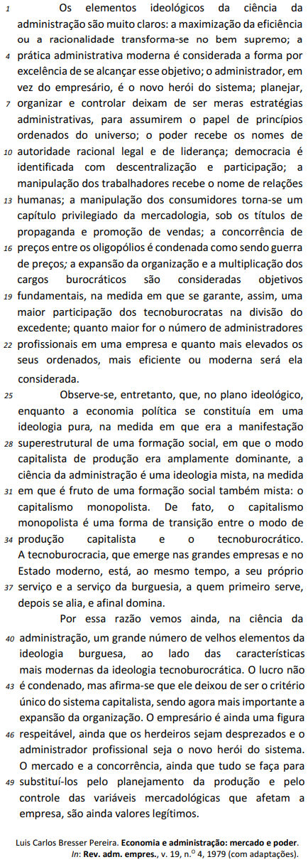 Cada uma das alternativas a seguir apresenta uma proposta de reescrita para o trecho “A tecnoburocracia, que emerge nas grandes empresas e no Estado moderno, está, ao mesmo tempo, a seu próprio serviço e a serviço da burguesia” (linhas de 35 a 37). Assinale a alternativa cuja proposta de reescrita mantém a correção gramatical e os sentidos desse trecho.