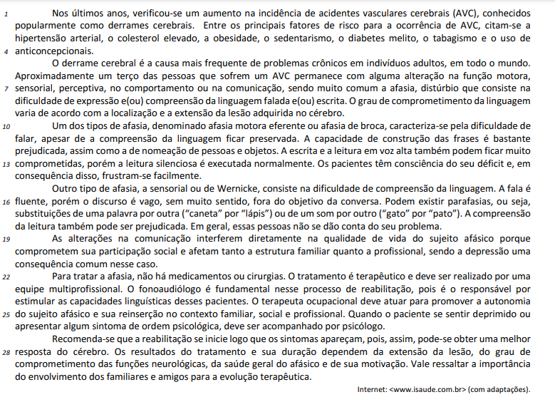 A supressão da vírgula empregada após “afasia” (linha 22) não prejudicaria a coerência do texto, mas comprometeria a sua correção gramatical.