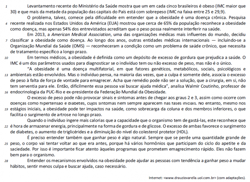 Depreende-se da leitura do texto que uma das causas da obesidade é a falta de determinação do indivíduo para manter o peso ideal.