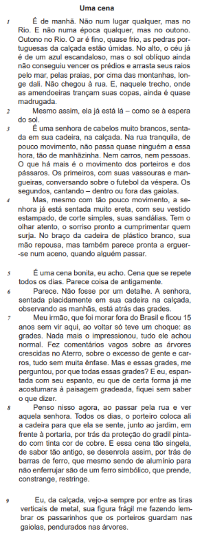 Esse texto, que se inicia a partir do cotidiano de uma velha senhora que tem por hábito sentar-se na calçada observando as manhãs, constrói uma crítica
