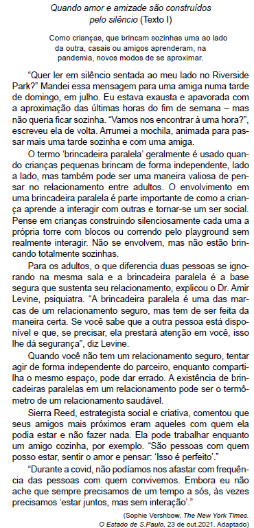 • C: Na frase – … tornar-se um ser social. (2o parágrafo) –, o termo ser pertence à mesma classe gramatical que em – A existência de brincadeiras paralelas em um relacionamento pode ser o termômetro… (4o parágrafo)