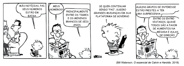 o pai se refere ao próprio filho como “grupos de interesse”, o que provoca uma quebra de expectativa no filho.