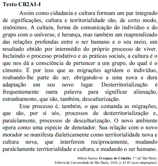A relação da cultura com a cidadania e a territorialidade constitui a ideia central do texto, que é predominantemente argumentativo.