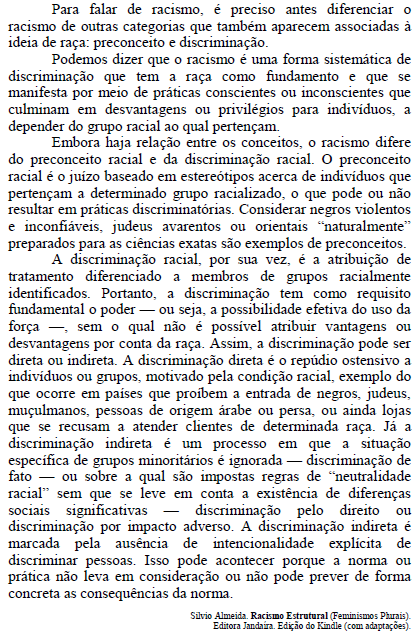 Infere-se das ideias do texto que o sistema de cotas raciais em universidades e concursos públicos consiste em um tipo de discriminação indireta, “marcada pela ausência de intencionalidade explícita de discriminar pessoas”.