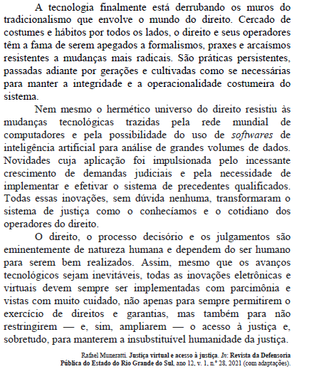 Segundo o texto, as inovações eletrônicas e virtuais, por serem executadas sem parcimônia, põem em risco o trabalho dos operadores do direito na medida em que suprimem o lado humano da justiça.