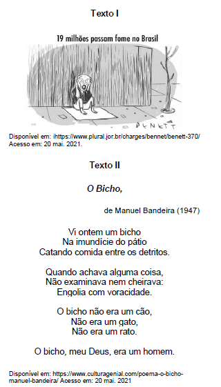 ( ) Como tema central, o texto II explora a banalização da fome e das condições sub-humanas em que muitos brasileiros vivem nas ruas – cena comum, sobretudo, no cotidiano dos grandes centros urbanos.