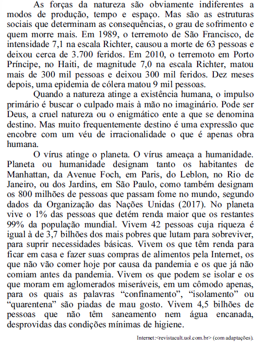 Sem prejuízo do sentido original e da correção gramatical do texto, o segundo período do terceiro parágrafo (“Planeta... Unidas (2017)).” poderia ser reescrito da seguinte forma: Os habitantes de Manhattan, os da Avenue Foch, em Paris, os do Leblon, no Rio de Janeiro, ou os dos Jardins, em São Paulo, tanto quanto os 800 milhões de pessoas que, segundo dados da Organização das Nações Unidas (2017), passam fome no mundo, enquadram-se na designação dos termos planeta e humanidade.