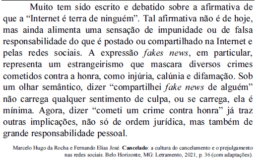 No texto, as frases ‘compartilhei fake news de alguém’ e ‘cometi um crime contra honra’ são consideradas equivalentes, já que o compartilhamento de fake news pode ser crime.