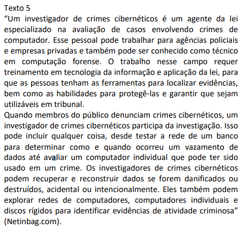 “Um investigador de crimes cibernéticos é um agente da lei especializado na avaliação de casos envolvendo crimes de computador. Esse pessoal pode trabalhar para agências policiais e empresas privadas e também pode ser conhecido como técnico em computação forense. O trabalho nesse campo requer treinamento em tecnologia da informação e aplicação da lei, para que as pessoas tenham as ferramentas para localizar evidências, bem como as habilidades para protegê-las e garantir que sejam utilizáveis em tribunal.”