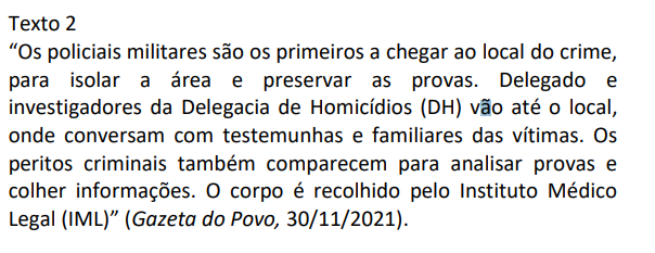 Observe bem a frase final do texto 2: “O corpo é recolhido pelo Instituto Médico Legal (IML)”.