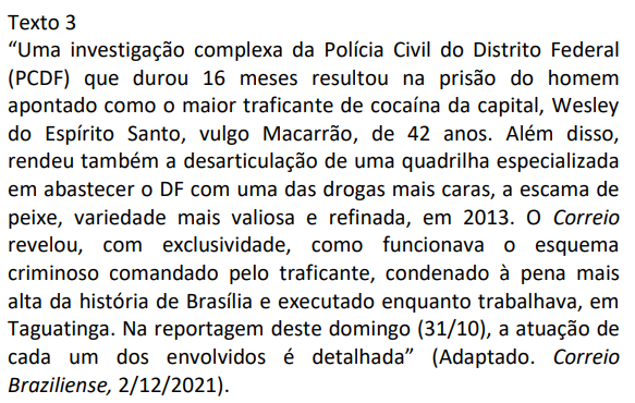 Nesse segmento do texto 3, há a substituição de um termo inicial (cocaína) por outro de valor geral (drogas); o mesmo acontece em:
