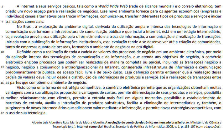 De acordo com o texto, o novo ambiente empresarial derivado da utilização do comércio eletrônico é, fundamentalmente, embasado no ambiente digital, cujo componente básico é a Internet.